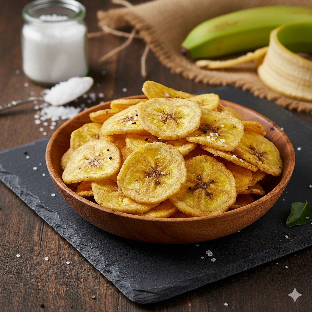 Crunchy, freshly made banana chips prepared using traditional Kerala methods and coconut oil.